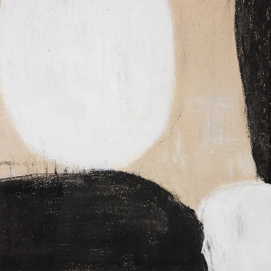 This striking abstract artwork masters the art of restraint. A beige foundation anchors bold black and white strokes that dance across the canvas, creating visual tension through deliberate simplicity. Grounded geometric forms ground the composition while energetic brushwork keeps it alive. Perfect for those seeking understated sophistication with undeniable impact—a piece that whispers elegance while commanding attention.