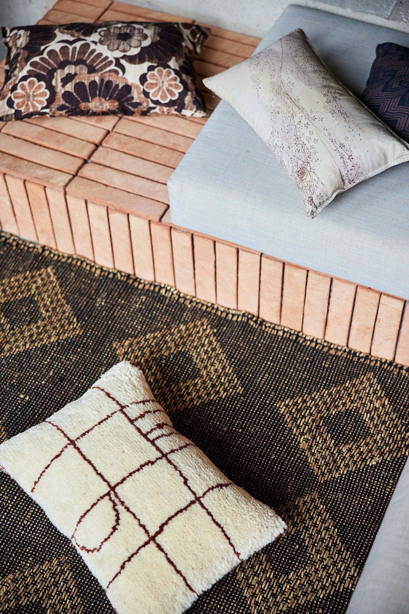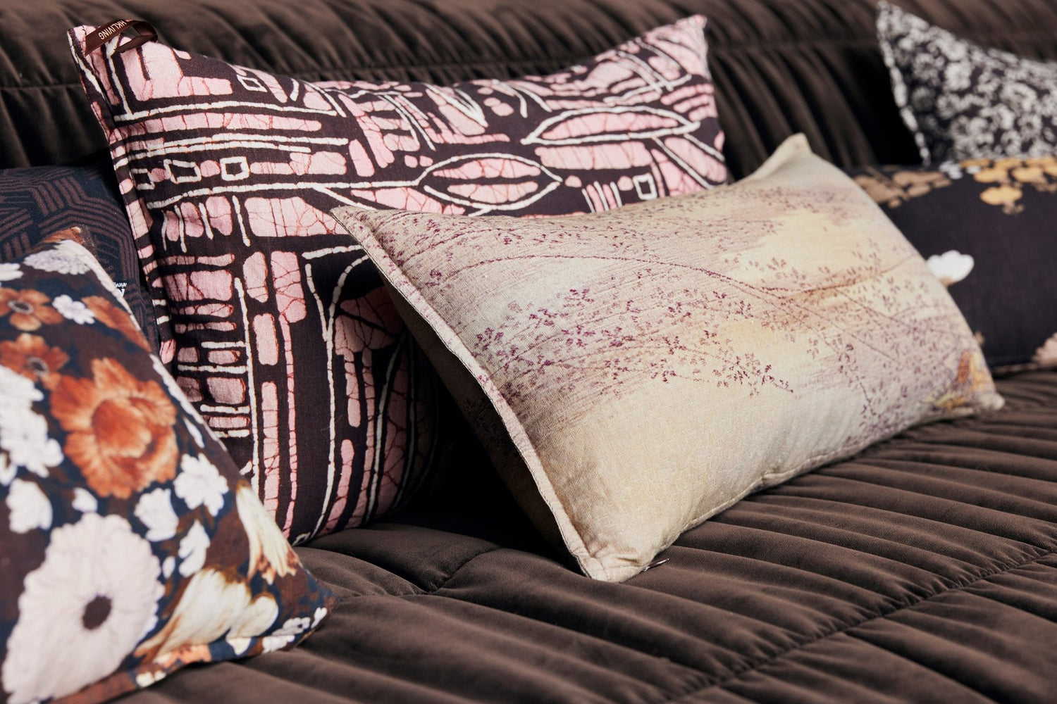 "This cushion is based on an original Japanese kimono I found at a market in Paris. I immediately fell in love with the print, the trees with their delicate blossoms and the creamy pink shade make you want to dream away back to the 70s." - DORIS