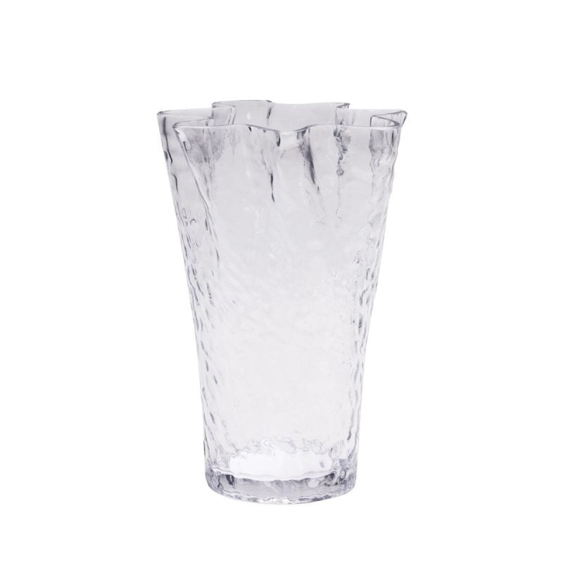This elegant ruffle vase will add a touch of sophistication to any room. Made of clear glass, it showcases your favorite flowers beautifully. Perfect for any occasion or as a decorative piece in your home. Make a statement with this charming ruffle vase.