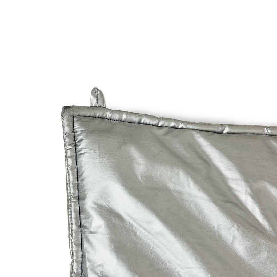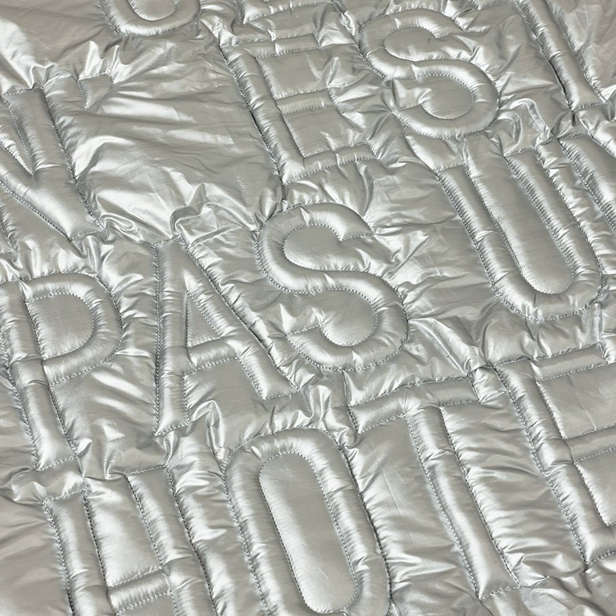 A true statement piece, this limited-edition wall rug in industrial silver blurs the line between art and design. Crafted from richly padded textile and embroidered with the phrase “Ceci n’est pas un hôtel” by Dutch artist Maaike Koster, it embodies bold materiality, wit, and modern craftsmanship.
